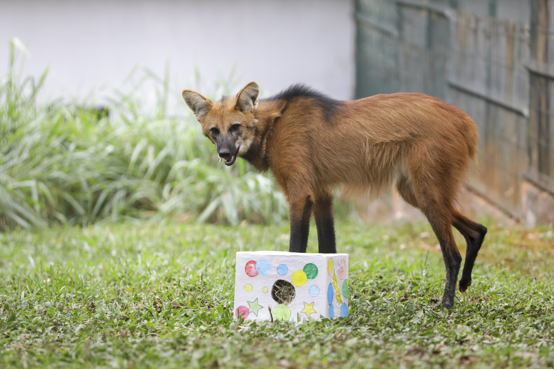 A prática, conhecida como enriquecimento alimentar, faz parte da rotina do zoo e envolve diversos animais que habitam o espaço. Essas técnicas são fundamentais para estimular os instintos naturais dos bichos. Além da lobo-guará Atena, jabutis e um tamanduá-bandeira também participaram da folia com as comidas surpresa. Aberta para visualização do público, a atividade utiliza recipientes recheados de aromas e surpresas, estimulando o faro e as habilidades motoras dos animais.