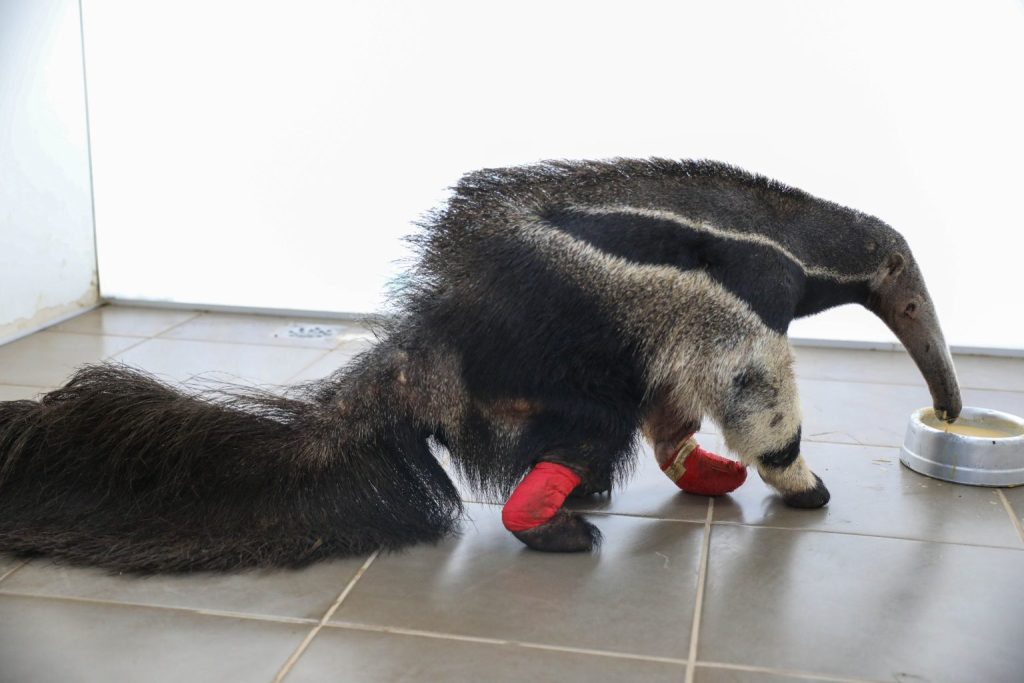 Já a tamanduá-bandeira fêmea, vítima do incêndio que se espalhou na Floresta Nacional, foi resgatada na segunda-feira (23) com queimaduras graves nas quatro patas e debilitada para procurar alimento. O filhote, por sua vez, chegou à unidade veterinária com queimaduras nos pés, mãos e na ponta do focinho. Atualmente ele é alimentado por sonda – e, como todos os demais pacientes, recebe cuidados para recuperação e reinserção na flora.