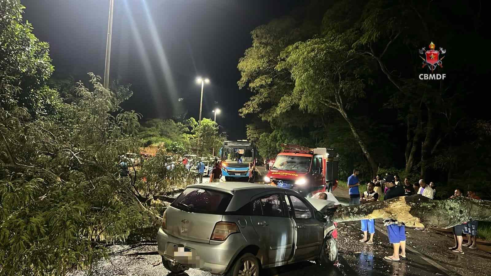 O Corpo de Bombeiros Militar do Distrito Federal atendeu, às 20h29 deste domingo (18/01/2026), uma ocorrência envolvendo a queda de uma árvore sobre um veículo na DF-280 entre Água Quente (DF) e Santo Antônio do Descoberto (GO). Duas viaturas foram empregadas no atendimento.