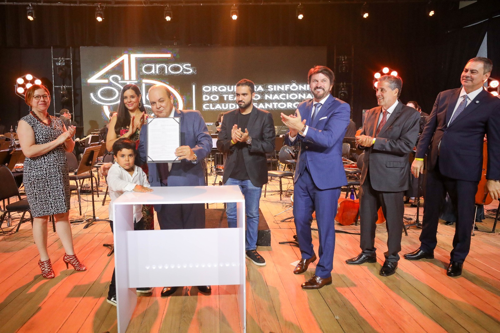 O governador Ibaneis Rocha assinou, nesta sexta-feira (20), a reestruturação da carreira dos músicos da Orquestra Sinfônica do Teatro Nacional Claudio Santoro (OSTNCS). O gesto ocorreu durante o evento oficial de inauguração de reabertura da Sala Martins Pena, com show da renomada orquestra brasiliense e da dupla Chitãozinho e Xororó.