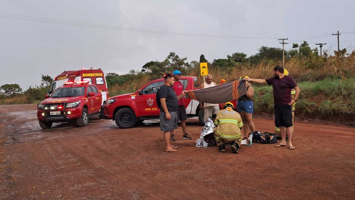 Ao chegarem ao local, os bombeiros encontraram as vítimas ao solo. O homem, ainda não identificado, estava consciente e apresentava fratura no pé esquerdo. Já a mulher, também consciente, queixava-se de dores na coluna e no peito. Ambos receberam atendimento pré-hospitalar e foram levados a uma unidade de saúde da região.