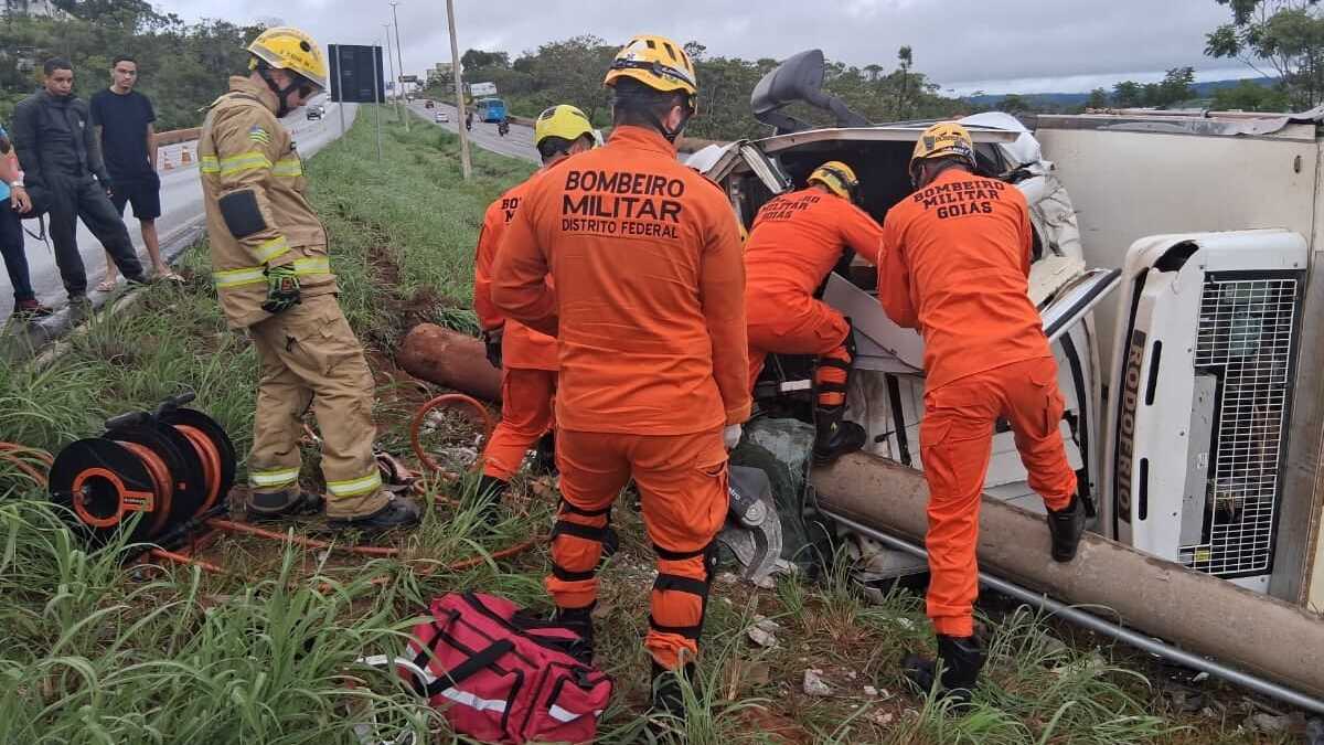 Um caminhão frigorífico capotou no fim da tarde desta segunda-feira (23) na BR-070, nas proximidades da Barragem do Rio Descoberto, no Distrito Federal. O motorista ficou preso às ferragens e precisou ser retirado pelos bombeiros.