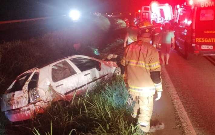 No local, as equipes encontraram um Fiat Palio branco fora da pista, capotado no canteiro central. A condutora e três passageiros receberam atendimento conforme protocolo de trauma.