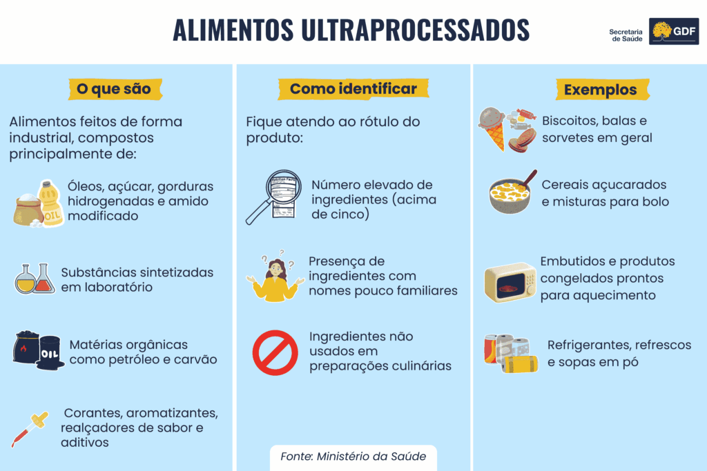 Uma forma simples de identificar esses produtos é observar o rótulo. O Ministério da Saúde orienta que listas extensas de ingredientes, geralmente com cinco ou mais itens e nomes pouco familiares, indicam que o alimento é ultraprocessado.