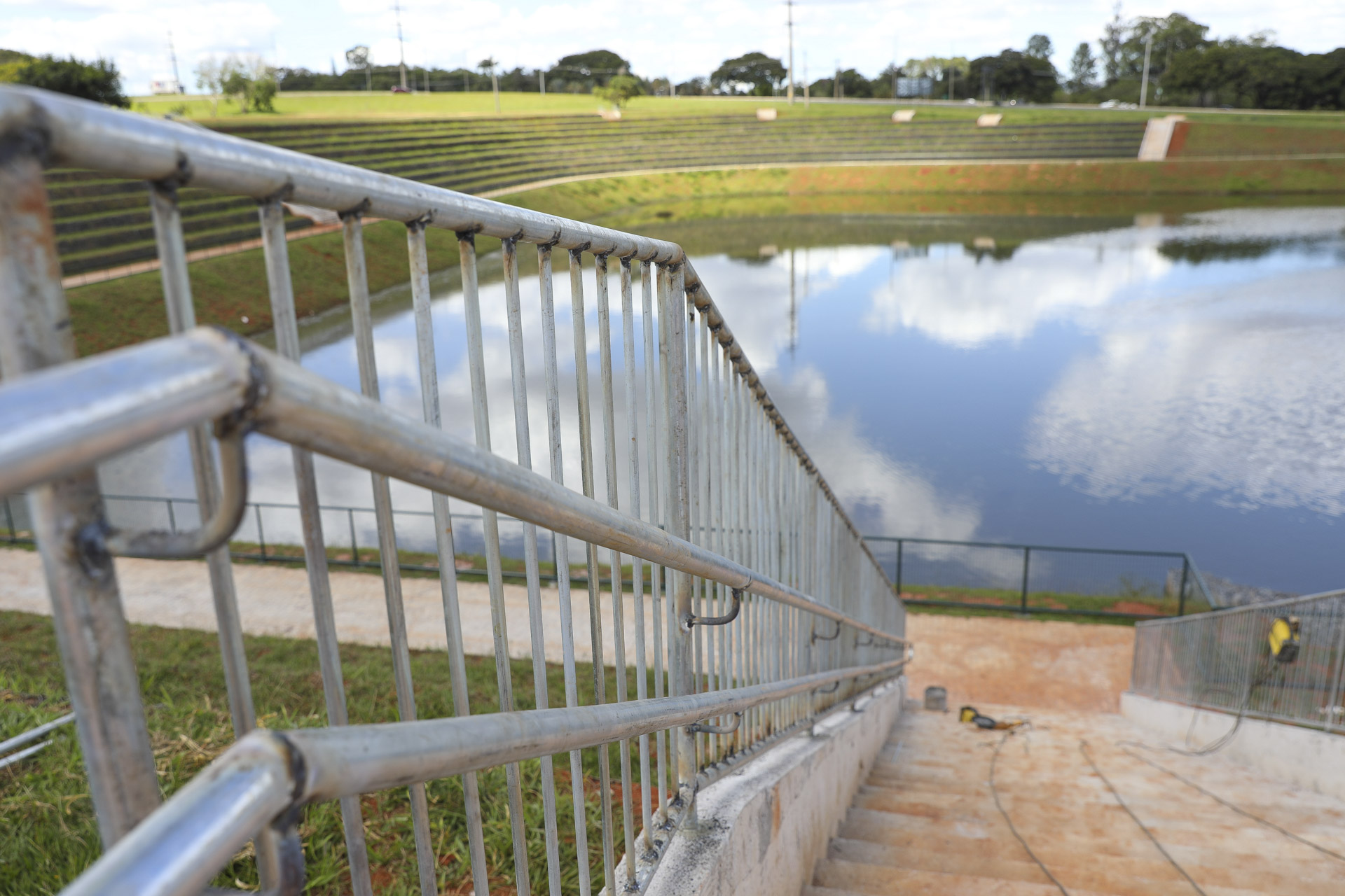As escadas de acesso à bacia de detenção do Drenar DF receberam guarda-corpos e corrimãos para garantir o conforto da população e evitar acidentes. As estruturas de passagem foram erguidas em 11 pontos ao redor do reservatório, próximo aos taludes, para permitir o acesso dos cidadãos ao espelho-d’água com segurança. As peças em aço galvanizado foram soldadas por empresa terceirizada. Os guarda-corpos têm altura de 1,2 metros, e os corrimãos foram instalados a 90 cm e 70 cm do solo, para serem acessível a todos.