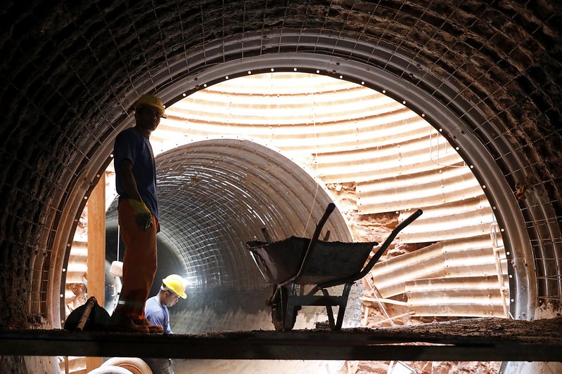 Concluída a escavação desse trecho, serão executados os serviços de montagem das chapas do método tunnel liner, injeção de solo-cimento, execução do concreto projetado e a conclusão dos dois poços de visita que estão na área.