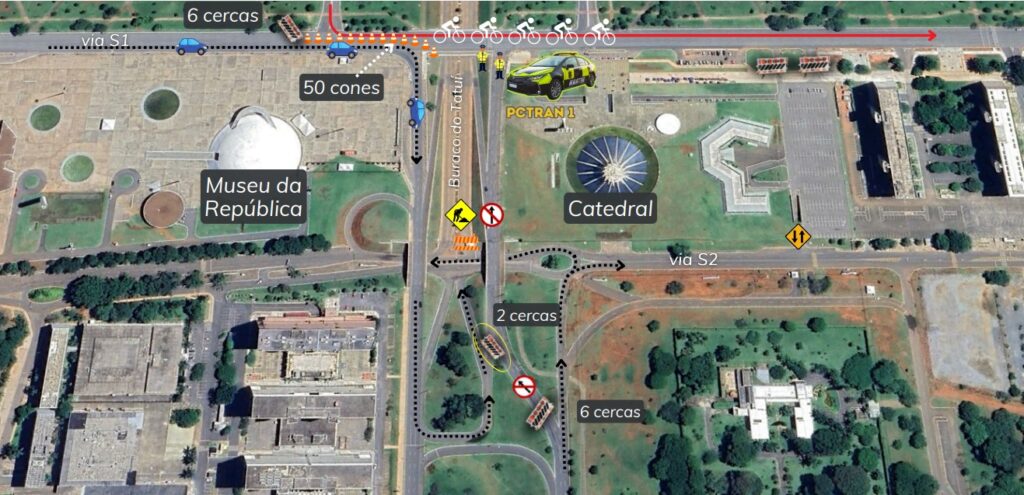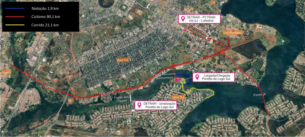 Provas de natação, ciclismo e corrida causarão interdições em importantes vias, como a Ponte Honestino Guimarães, EPNA, EPGU, via JK e Ponte JK. Interdições começam às 5h, com ações coordenadas pelo Detran-DF, DER-DF e PMDF. A previsão é que o trânsito seja normalizado até as 13h.