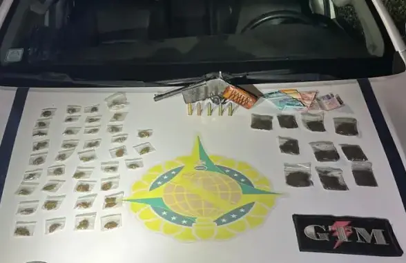 Foram apreendidos uma arma de fogo artesanal calibre .38, cinco munições intactas do mesmo calibre, 39 porções de skunk, 10 porções de maconha, além de R$ 137 em espécie. Um indivíduo foi preso e outros dois foram detidos.