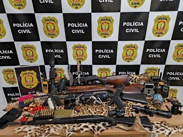 Na manhã desta segunda-feira (24), a Polícia Civil do Distrito Federal cumpriu dois mandados de busca que resultaram na apreensão de oito armas de fogo, munições, acessórios e até um couro de onça-pintada — animal cuja caça é crime ambiental.