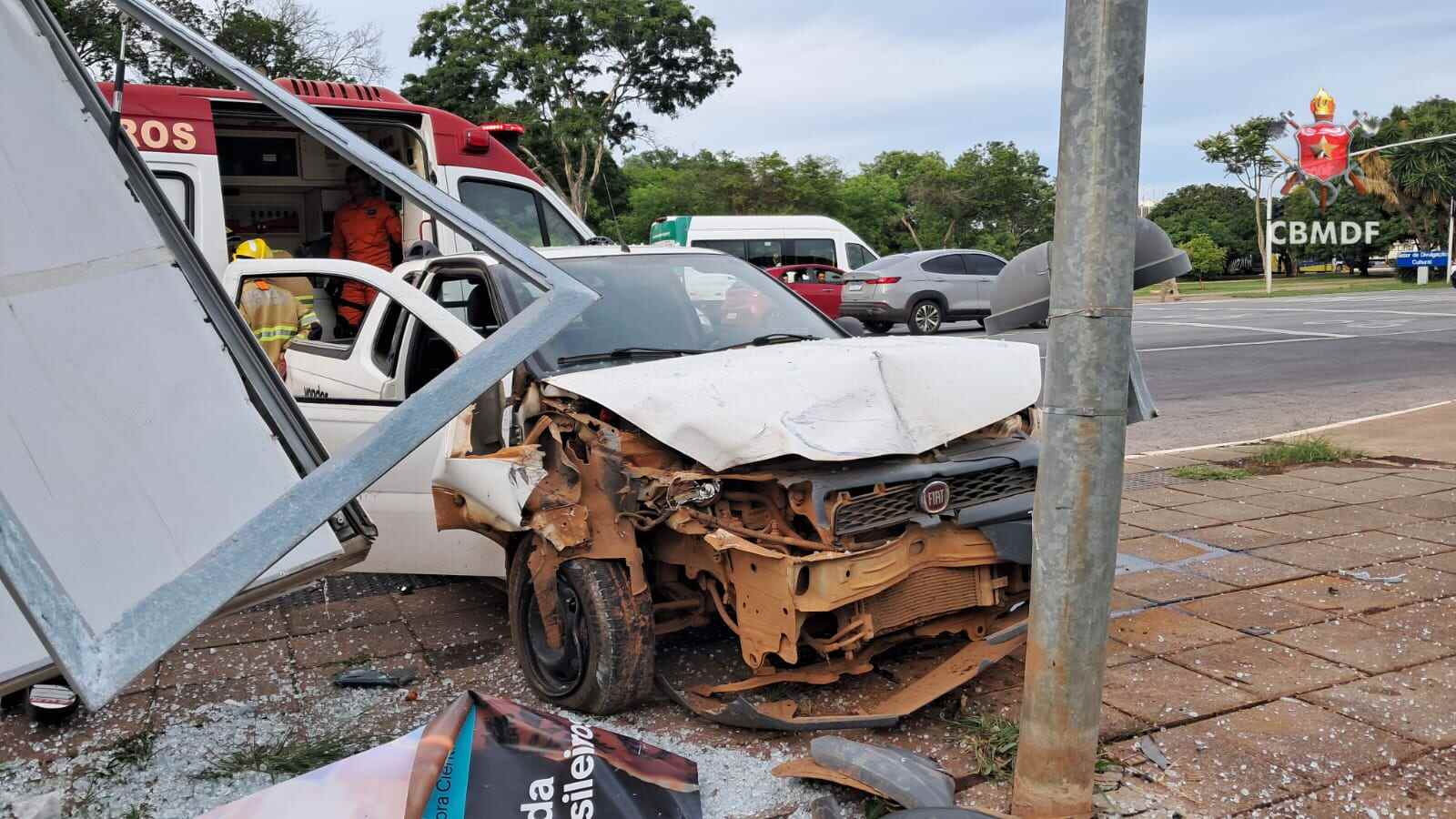 Uma colisão entre um ônibus do transporte coletivo e um Fiat Strada provocou um acidente de grandes proporções na Via N1, próximo ao Centro de Convenções Ulysses Guimarães, no Plano Piloto, na tarde desta terça-feira (25). Depois do impacto inicial, o carro perdeu o controle, subiu no canteiro, destruiu uma parada de ônibus e atingiu um poste de iluminação pública.
