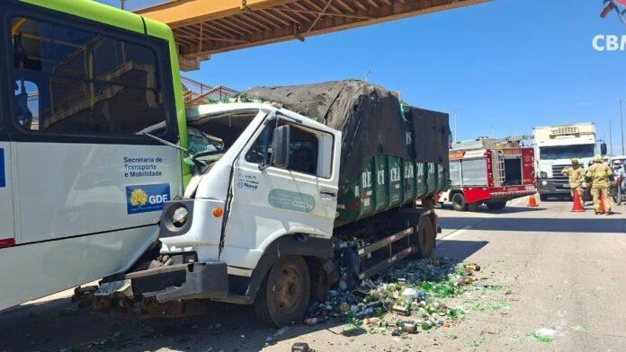 Uma colisão entre um caminhão e um ônibus deixou uma passageira ferida na manhã desta terça-feira (18), na Estrutural, sentido Plano Piloto. O Corpo de Bombeiros Militar do Distrito Federal foi acionado às 10h03 e empenhou quatro viaturas no atendimento da ocorrência, que causou interdição parcial da via.