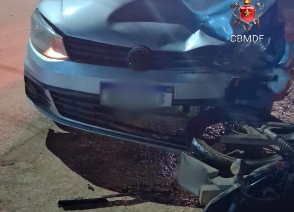 O Corpo de Bombeiros Militar do Distrito Federal (CBMDF) foi acionado às 22h12 desta quarta-feira (10/12) para atender uma colisão frontal entre um carro e uma motocicleta na Rua 27 do Residencial do Bosque, em São Sebastião. Duas viaturas foram enviadas ao local.