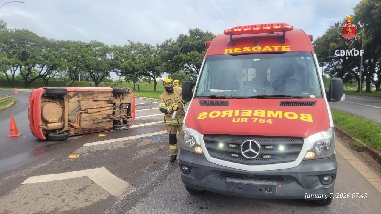 Um Volkswagen Gol vermelho capotou na manhã desta quinta-feira (7) e deixou uma pessoa ferida na EPIA, próximo ao Park Shopping, em Brasília. A ocorrência mobilizou equipes do Corpo de Bombeiros Militar do Distrito Federal (CBMDF) às 7h25.
