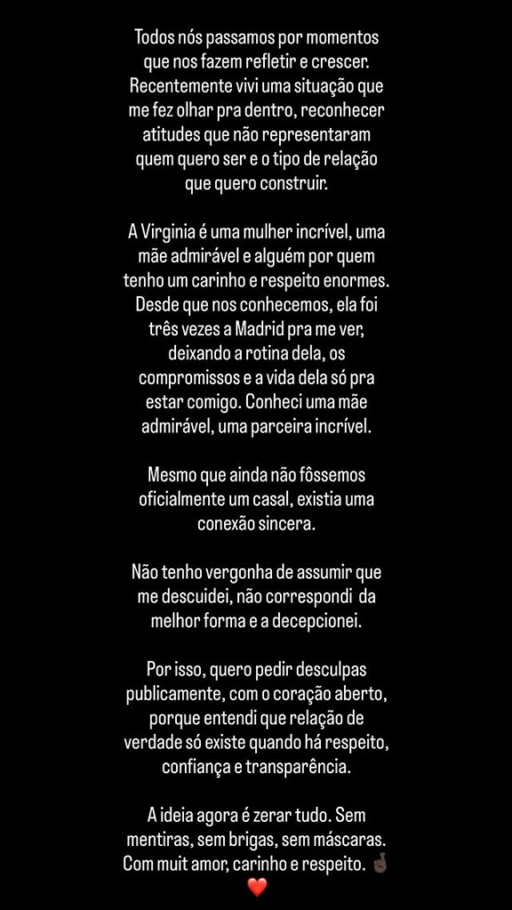 “Reconheço atitudes que não representaram quem quero ser. A Virginia é uma mulher incrível, uma mãe admirável. Mesmo que ainda não fôssemos oficialmente um casal, existia uma conexão sincera. Me descuidei, não correspondi da melhor forma e a decepcionei.”