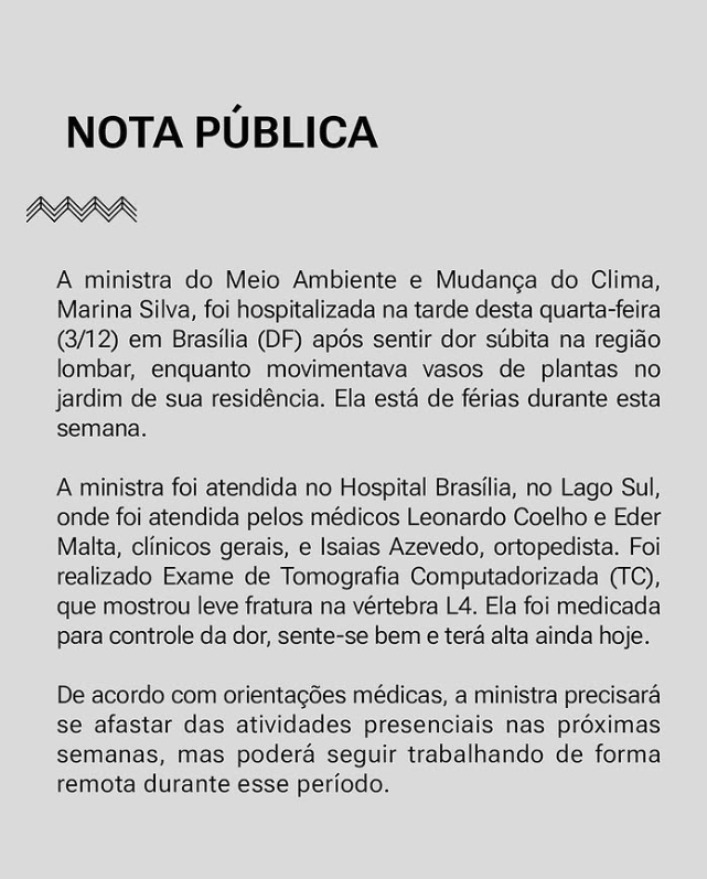 A ministra do Meio Ambiente e Mudança do Clima, Marina Silva, foi hospitalizada na tarde desta quarta-feira (3/12), em Brasília, após sentir uma dor súbita na região lombar. O incômodo ocorreu enquanto ela movimentava vasos de plantas no jardim de sua residência. Marina está de férias nesta semana.