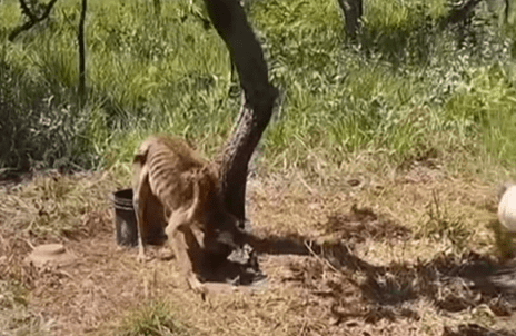 No momento do resgate, o cão apresentava caquexia, desidratação acentuada e ferimentos pelo corpo, sinais claros de sofrimento prolongado.