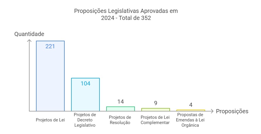 De modo geral, os números da Comunicação refletem a intensa produção legislativa dos parlamentares. Em 2024, 352 proposições foram aprovadas, um aumento de 19% com relação ao ano anterior. Desse quantitativo, são 221 Projetos de Lei, 104 Projetos de Decreto Legislativo, 14 Projetos de Resolução, 9 Projetos de Lei Complementar e 4 Propostas de Emenda à Lei Orgânica, que aprovados em plenário e nas comissões.